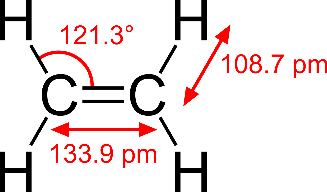 两个碳原子以双键共价连接。氢原子和碳原子之间通过一个共价键相连。